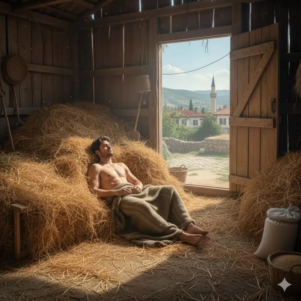 Almanya’da yaşayan bir genç, köydeki ailesini ziyarete gelir. Üstü başı dağınık hâlde görünce ailesi onu “beş parasız gelmişsin” diye azarlayıp ahırda yatırır.